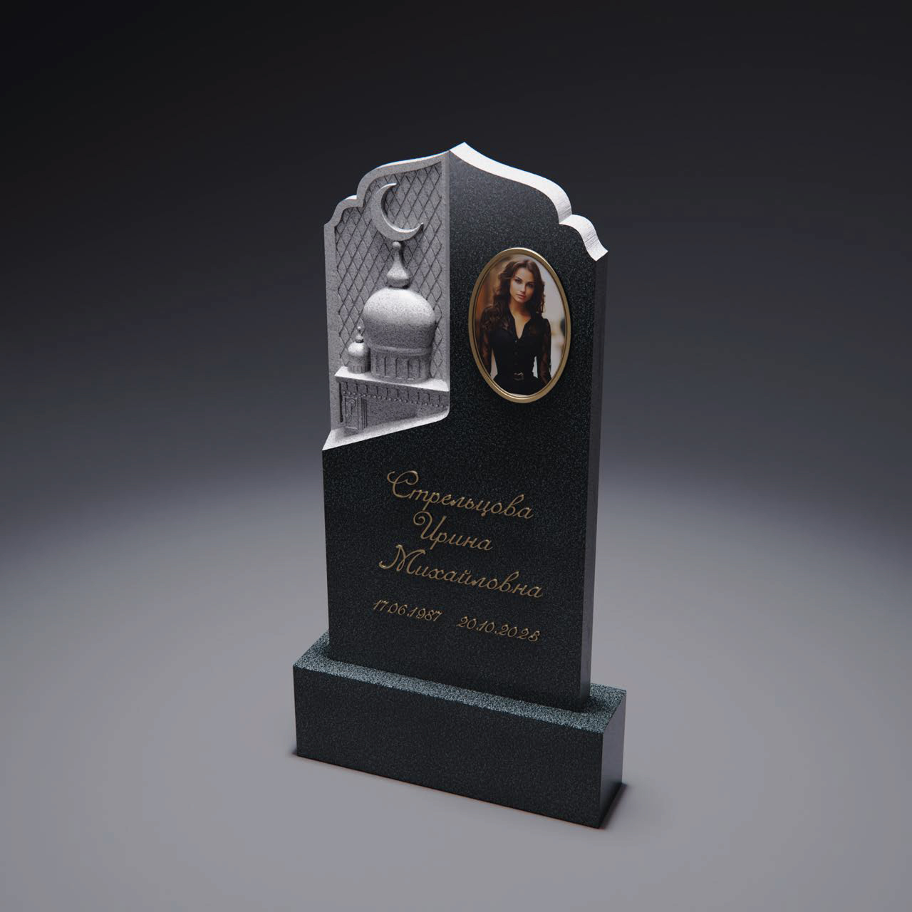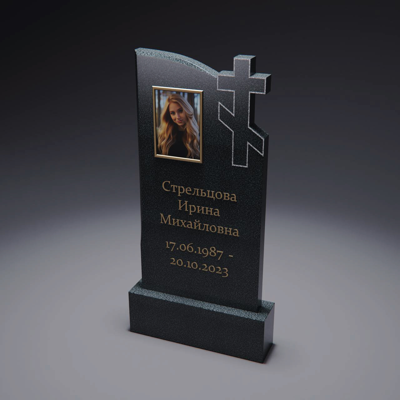 Вертикальный памятник с плавно изогнутыми линиями и необычным асимметричным силуэтом. Форма создаёт динамичный образ и подчёркивает индивидуальность. В верхней части расположен овальный керамический портрет, гармонично выделяющийся на фоне отполированного чёрного гранита. Золотистая надпись в классическом стиле придаёт композиции выразительность.