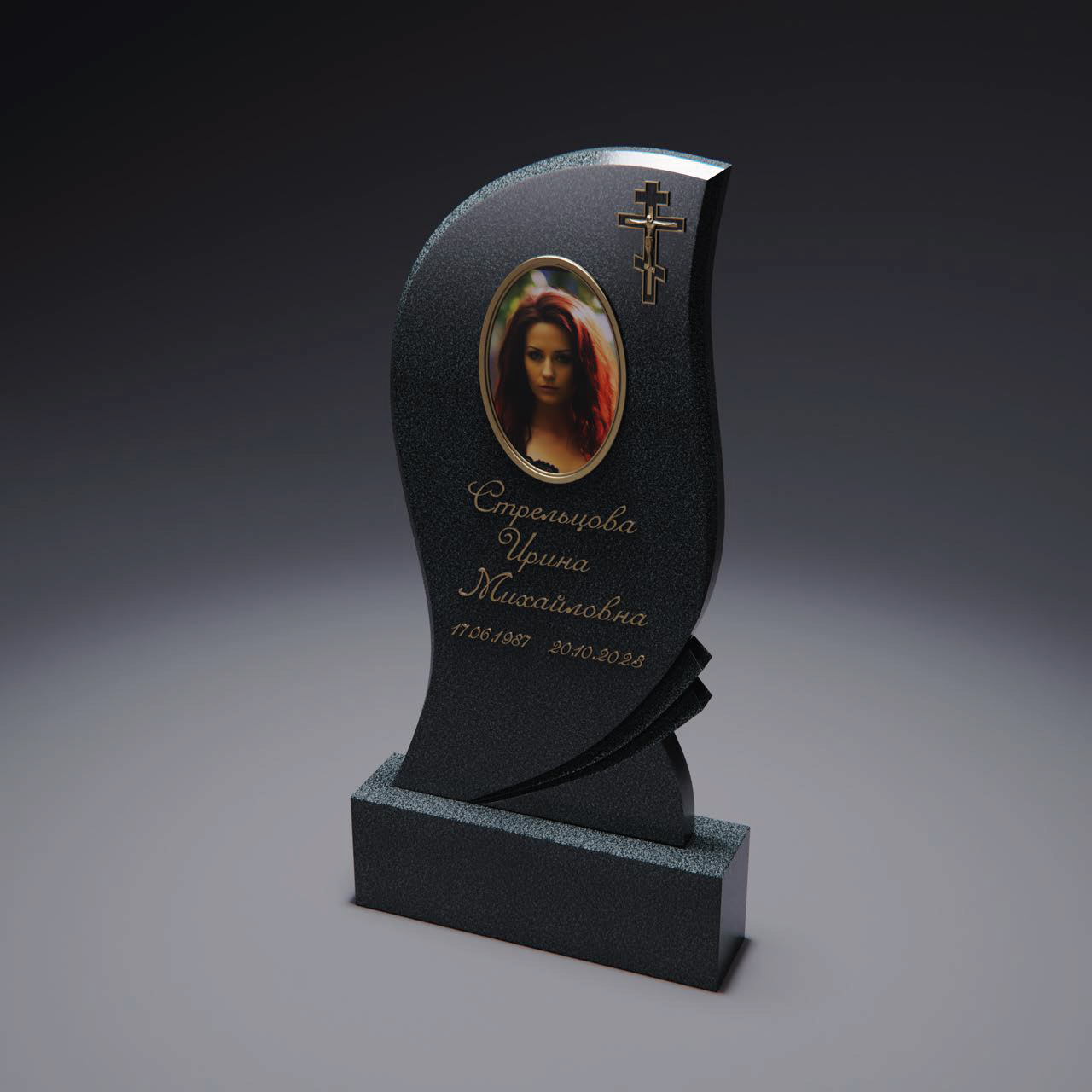 Эффектный памятник с декоративным элементом в виде ленты у основания. Плавное завершение и утончённый изгиб делают композицию гармоничной. В верхней части расположен овальный керамический портрет, а над ним аккуратно размещён крест. Золотая надпись на зеркально отполированной поверхности гранита смотрится выразительно и благородно.