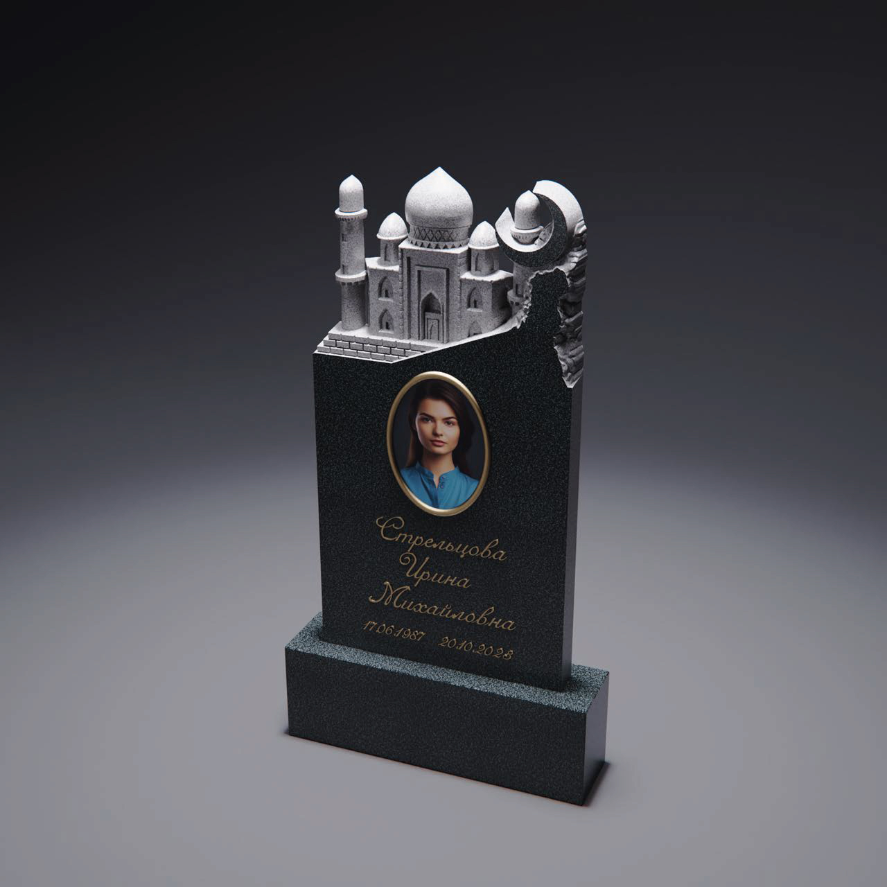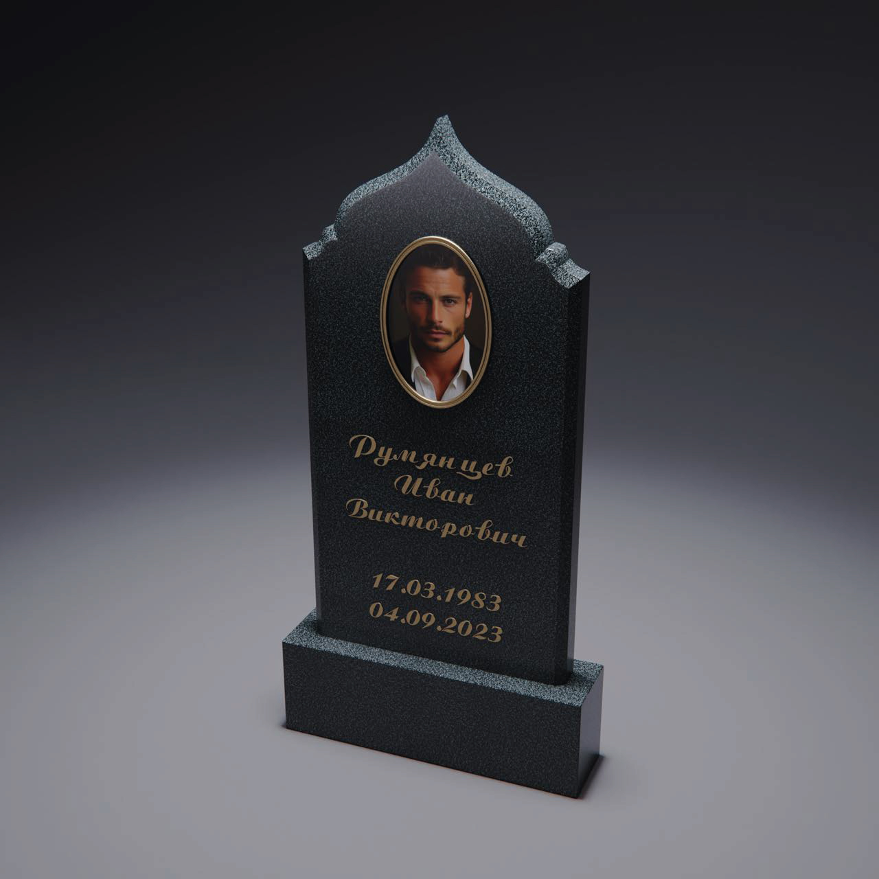 Строгий памятник с плавно изогнутым силуэтом и декоративным крестом, который встроен в верхнюю часть композиции. Овальный керамический портрет гармонично выделяется на фоне полированного гранита. Симметричная форма и золотая надпись придают памятнику торжественность и благородство, подчёркивая уважение к памяти.